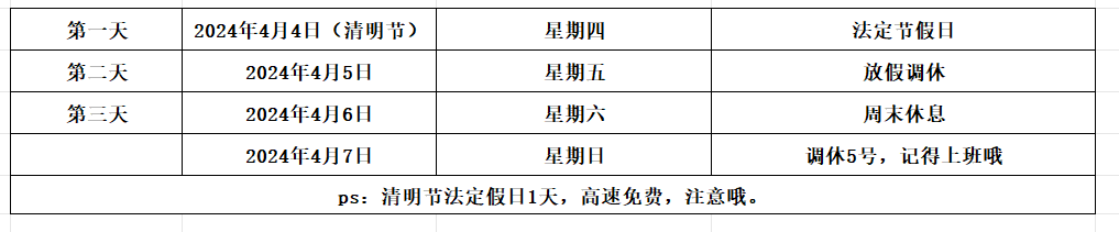 2024年清明节从4月4日开始放假到4月6日放假结束,4月7日上班。今年清明节高速免费时间:4月4日0时-4月6日24时。