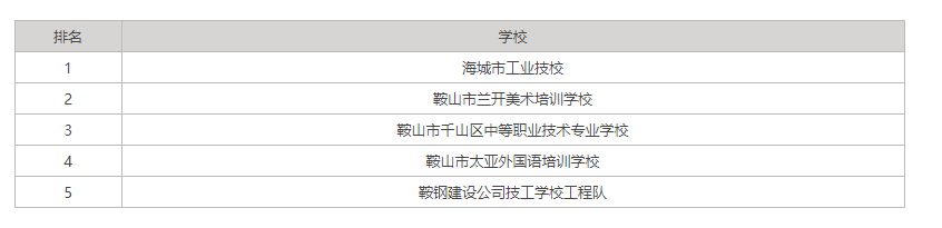 根据下表可知,海城市工业技校排名第一;鞍山市兰开美术培训学校排名第二;鞍山市千山区中等职业技术专业学校排名第三;鞍山市太亚外国语培训学校排名第四。具体详细信息如下: