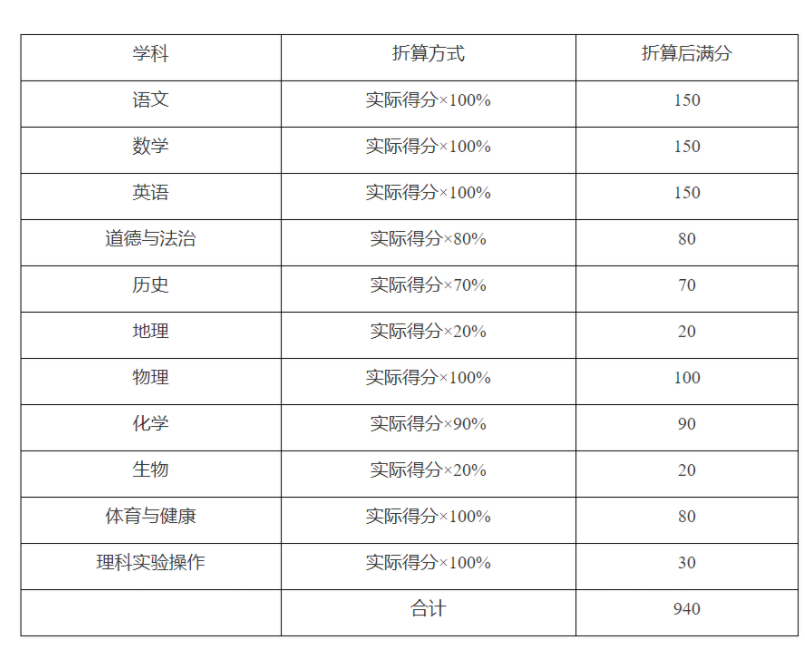 语文150分,数学150分,外语150分(含听力测试30分),文科综合200分(道德与法治100分、历史100分),理科综合200分(物理100分、化学100分),地理100分,生物100分,体育与健康80分,理科实验操作30分(物理、化学各15分)。