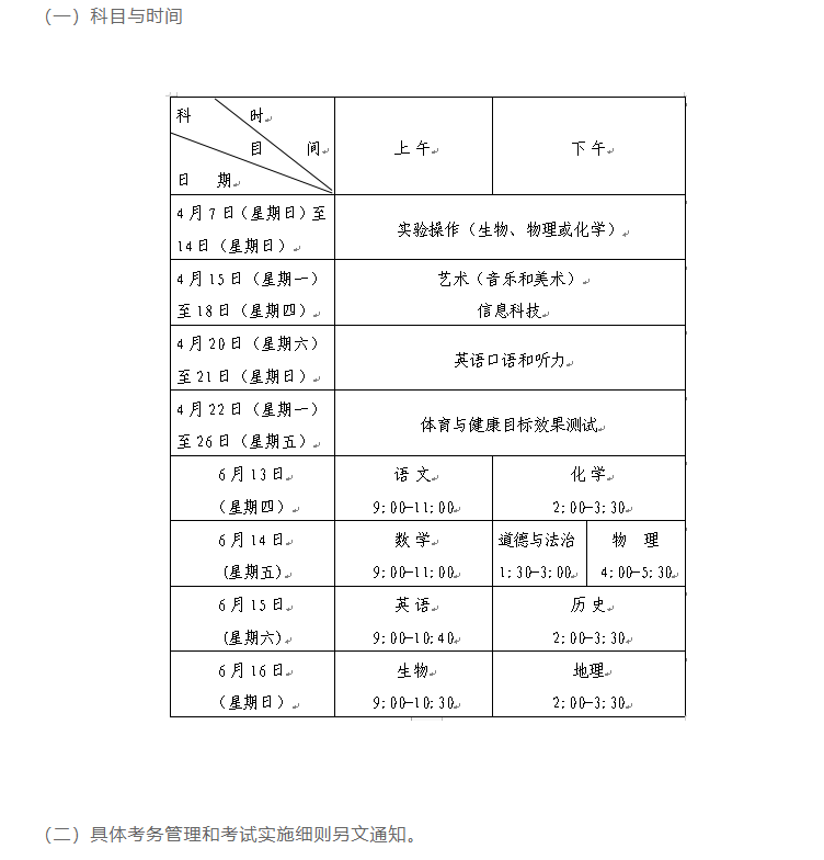 根据青岛市教育局公布的《山东青岛2024年全市初中学业水平考试网上志愿填报及有关考试的通知》了解到,山东青岛2024年中考时间及科目安排已公布,安排在6月13日-16日期间。具体如下: